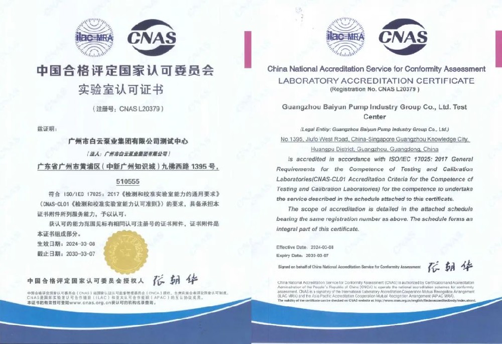 喜訊|白云泵業(yè)集團(tuán)測(cè)試中心通過CNAS國(guó)家實(shí)驗(yàn)室認(rèn)可